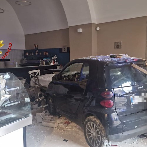 Attimi di terrore ieri pomeriggio, 5 ottobre, a Fuorni (Salerno). Per cause ancora in corso di accertamento, un uomo è balzato con l'auto, una Smart, all'interno del ristorante Compagnia del Concord, sfondando la parete e terminando la corsa al centro della sala.