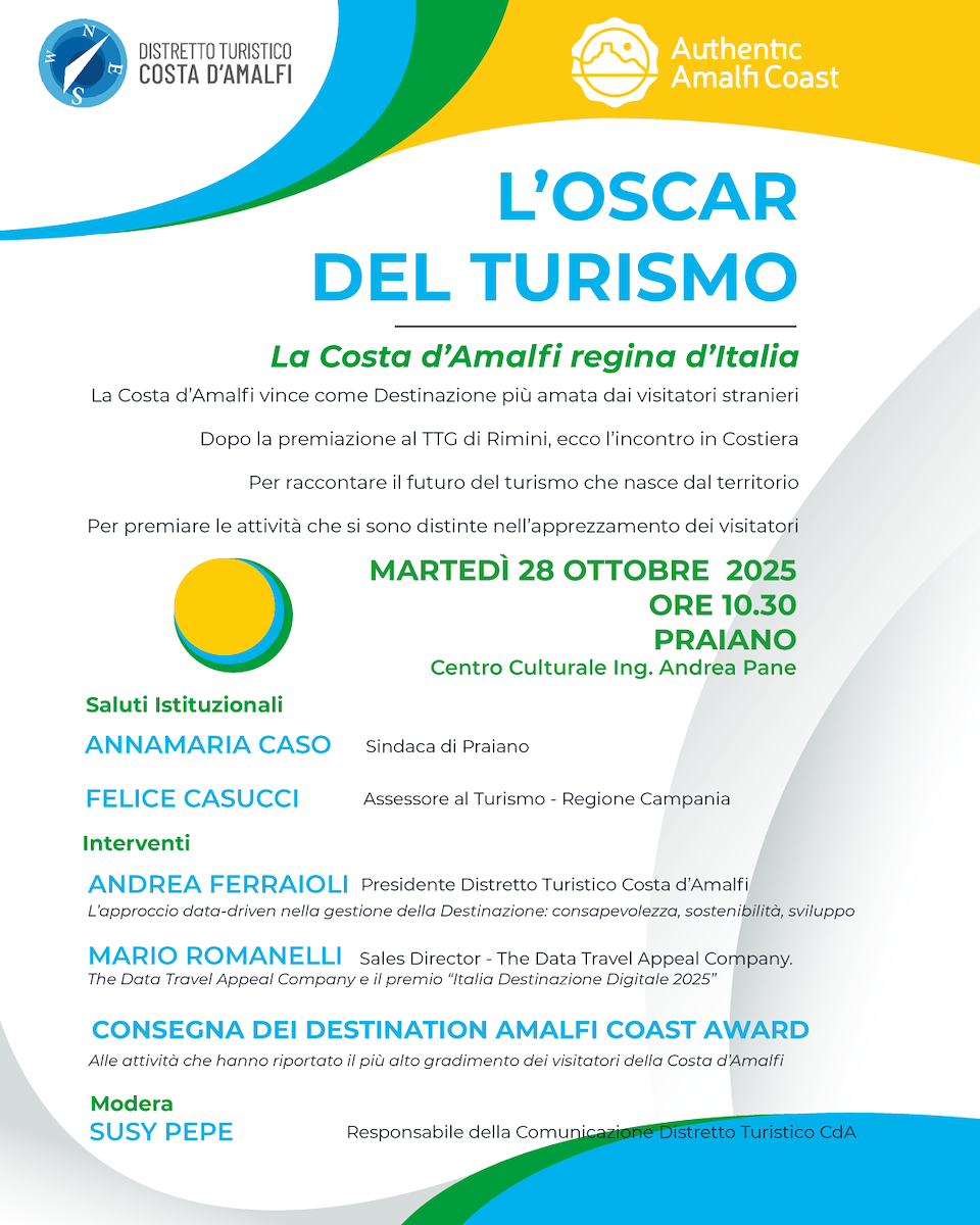 Dopo aver conquistato il premio "Italia Destinazione Digitale 2025"come meta più apprezzata dagli stranieri in Italia, la Costa d'Amalfi si prepara a condividere i dati ufficiali che hanno portato all'Oscar del Turismo. L'appuntamento è per martedì 28 ottobre 2025, alle ore 10.30, presso il Centro Culturale "Ing. Andrea Pane" di Praiano, per un incontro promosso dal Distretto Turistico Costa d'Amalfi, che oltre la presentazione dei dati della stagione turistica vedrà per la prima volta assegnare i "Destination Amalfi Coast Award" i riconoscimenti alle realtà con la migliore reputazione digitale del territorio.