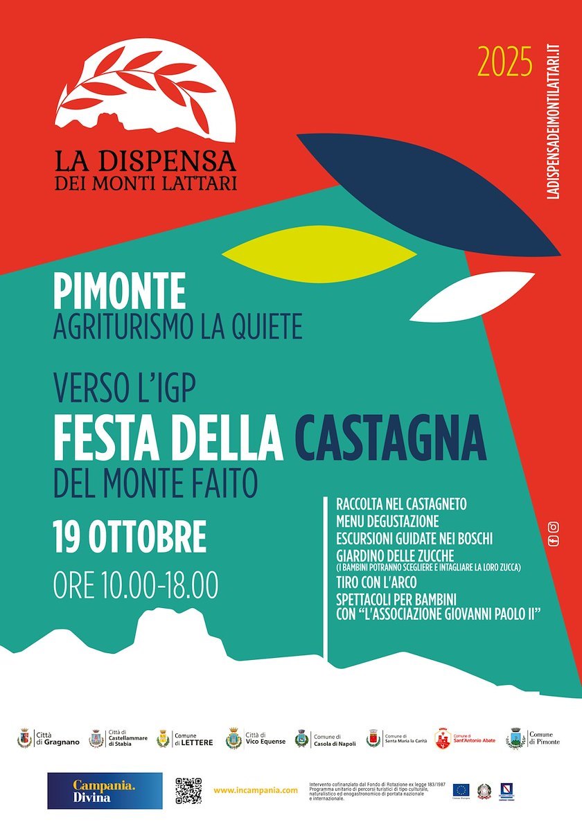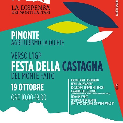 Dopo le tappe di successo nelle varie località dei Monti Lattari, domenica 19 ottobre l'iniziativa approda a Pimonte, all'Agriturismo La Quiete, con un evento interamente dedicato a uno dei simboli identitari del territorio: la castagna del Monte Faito, prodotto per il quale è in corso l'iter di riconoscimento dell'Igp - Indicazione geografica protetta.