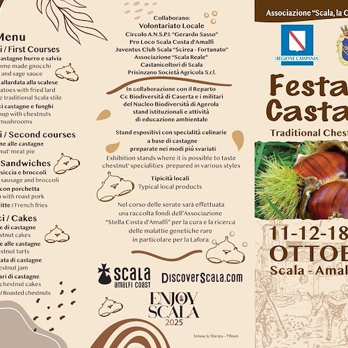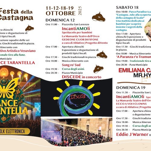 Appuntamento quindi a Scala, l'11, 12, 18 e 19 ottobre, per vivere insieme l'atmosfera unica della Festa della Castagna, tra gusto, musica, tradizioni e tanto divertimento!