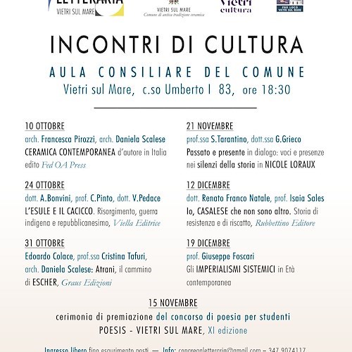 L'associazione culturale La Congrega Letteraria, in collaborazione con il Comune di Vietri sul Mare e la Pro Loco Vietri sul Mare, è lieta di presentare il calendario di Incontri di cultura,XII edizione. Gli eventi, inseriti nella programmazione comunale "Vietri Cultura" si terranno presso la prestigiosa aula consiliare del comune, in c.so Umberto I 83, con inizio alle ore 18:30.