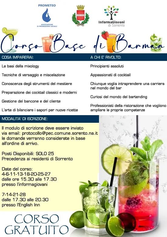 Sono ufficialmente aperte le iscrizioni al corso base gratuito di barman, promosso dall'Associazione Prometeo, dal Comune di Sorrento e dallo Sportello Informagiovani, in collaborazione con l'English Inn.