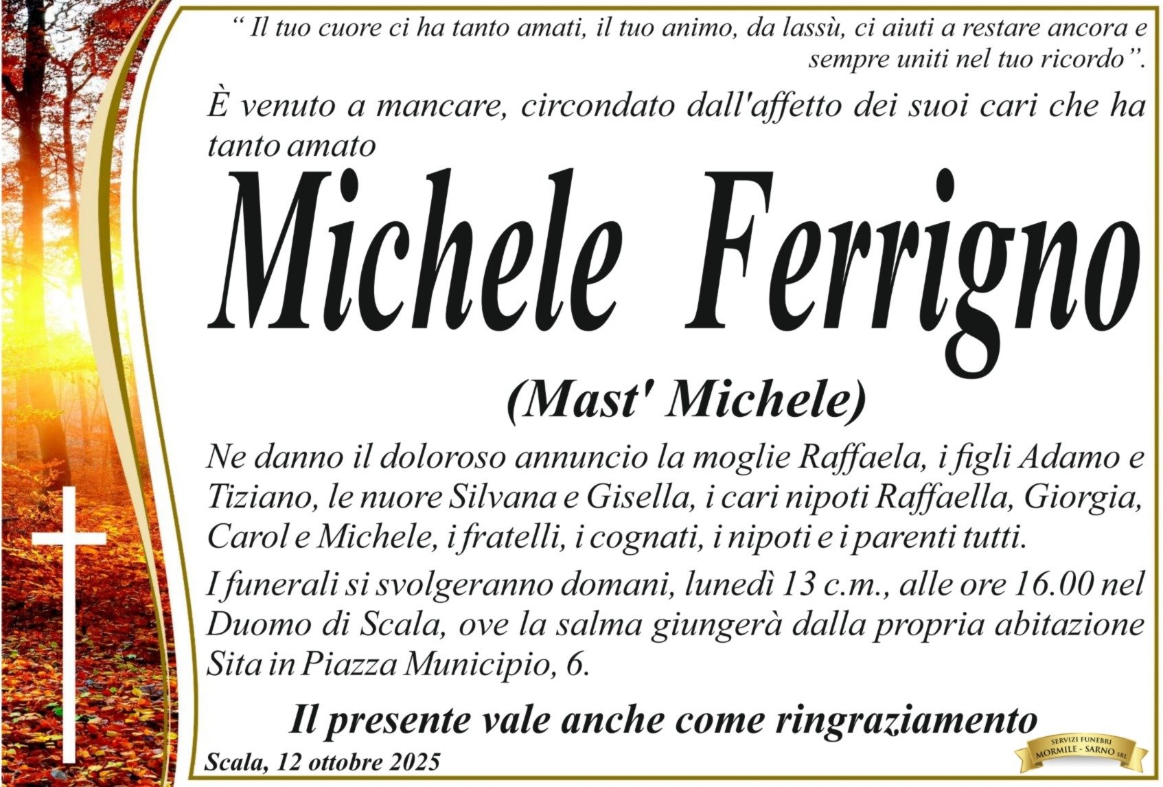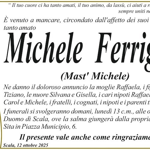 Scala piange la scomparsa di Michele Ferrigno, storico imprenditore edile e autentico punto di riferimento per il settore delle costruzioni nella Costiera Amalfitana. Si è spento ieri, domenica 12 ottobre, nella sua abitazione in piazza Municipio, all'età di 84 anni.