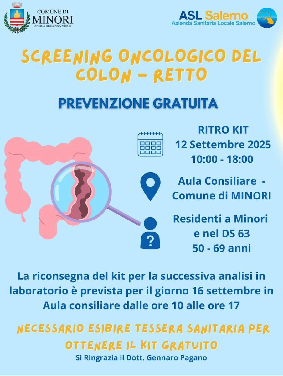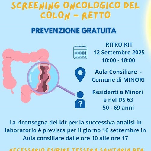 L'Amministrazione Comunale di Minori, accogliendo e organizzando sul territorio l'iniziativa promossa dall'ASL Salerno, grazie all'impegno di Giuseppe Bonito e Mattia Ruocco, ha reso possibile uno screening oncologico gratuito per la prevenzione del tumore del colon-retto, rivolto ai cittadini di età compresa tra i 50 e i 69 anni.