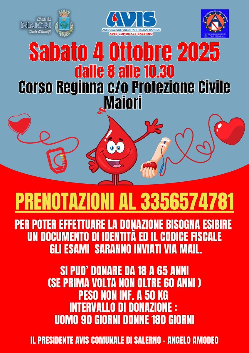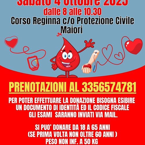 Sabato 4 ottobre sarà possibile donare il sangue dalle ore 8 alle ore 10.30 nei pressi di Palazzo Mezzacapo, a Maiori, più precisamente nell'area antistante al monumento di San Pio grazie all'Avis Comunale Salerno.