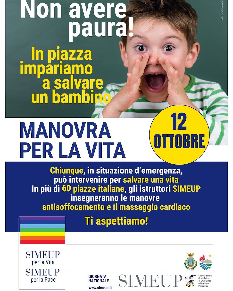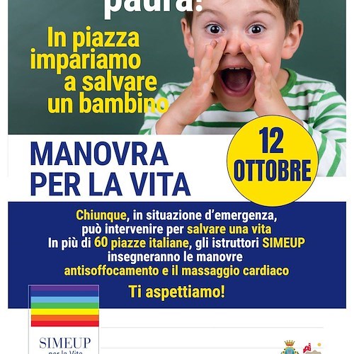 L'iniziativa, "Manovre per la vita", che si terrà contemporaneamente in circa 60 piazze d'Italia (sei delle quali in Campania e due nell'ambito dell'ASL Napoli 3 Sud, tra cui Vico Equense e Pompei), ha come obiettivo quello di diffondere nella popolazione le corrette manovre di primo soccorso in caso di arresto cardiopolmonare e soffocamento in età pediatrica.