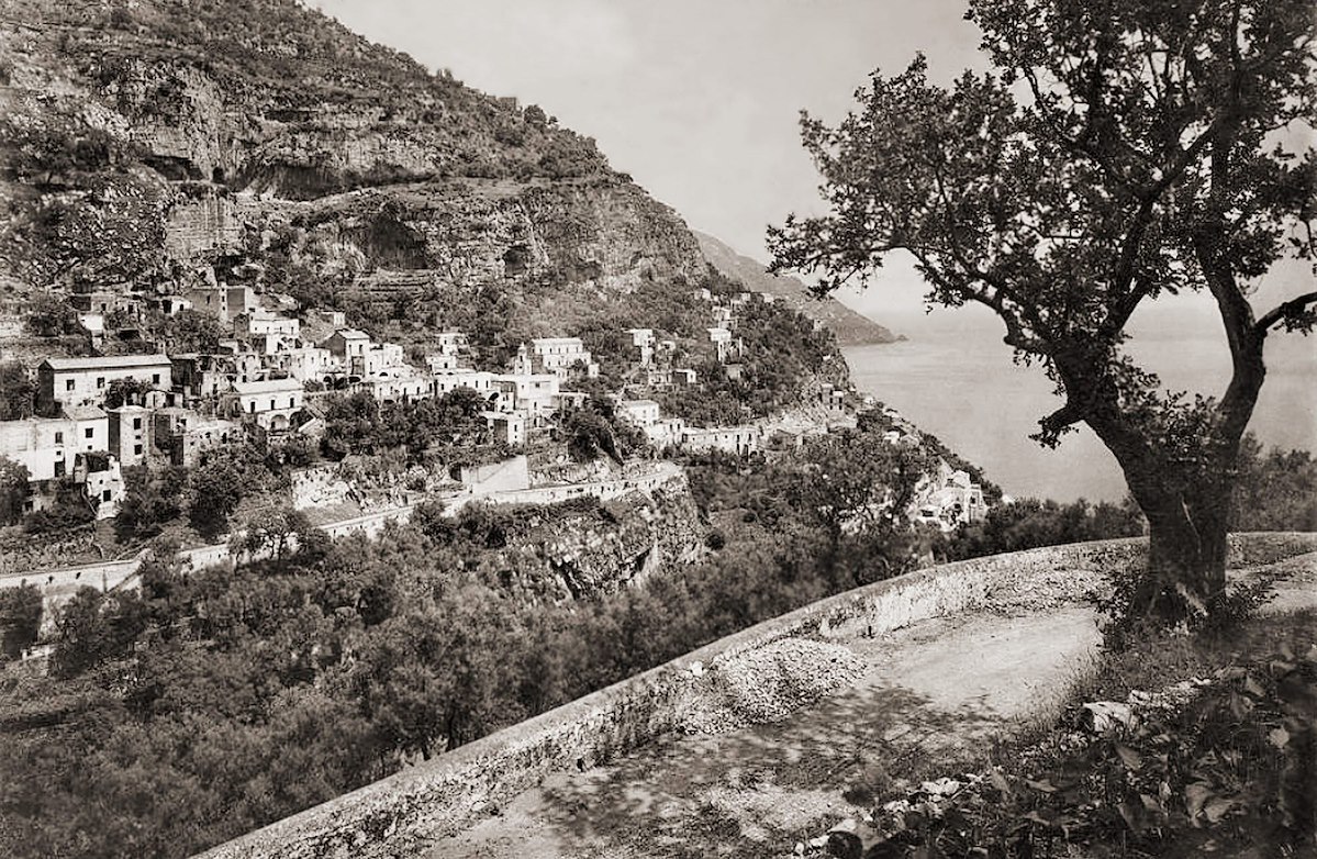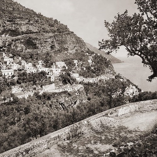 Una fotografia in bianco e nero del 1860, appartenente alle Edizioni Brogi e rilanciata sui social da Giovanni Forgione, restituisce un'inedita prospettiva di Positano. Lo scatto ritrae il borgo dall'alto, con il fotografo posizionato lungo la nuova strada amalfitana, le spalle rivolte a Punta Campanella e lo sguardo verso Salerno.
