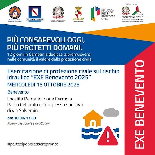 Si terrà nel giorno del ricordo dell'alluvione di Benevento che il 15 ottobre 2015 mise in ginocchio il Sannio, l'esercitazione di protezione civile per la gestione delle emergenze connesse al rischio idraulico ed idrogeologico nel Sannio.